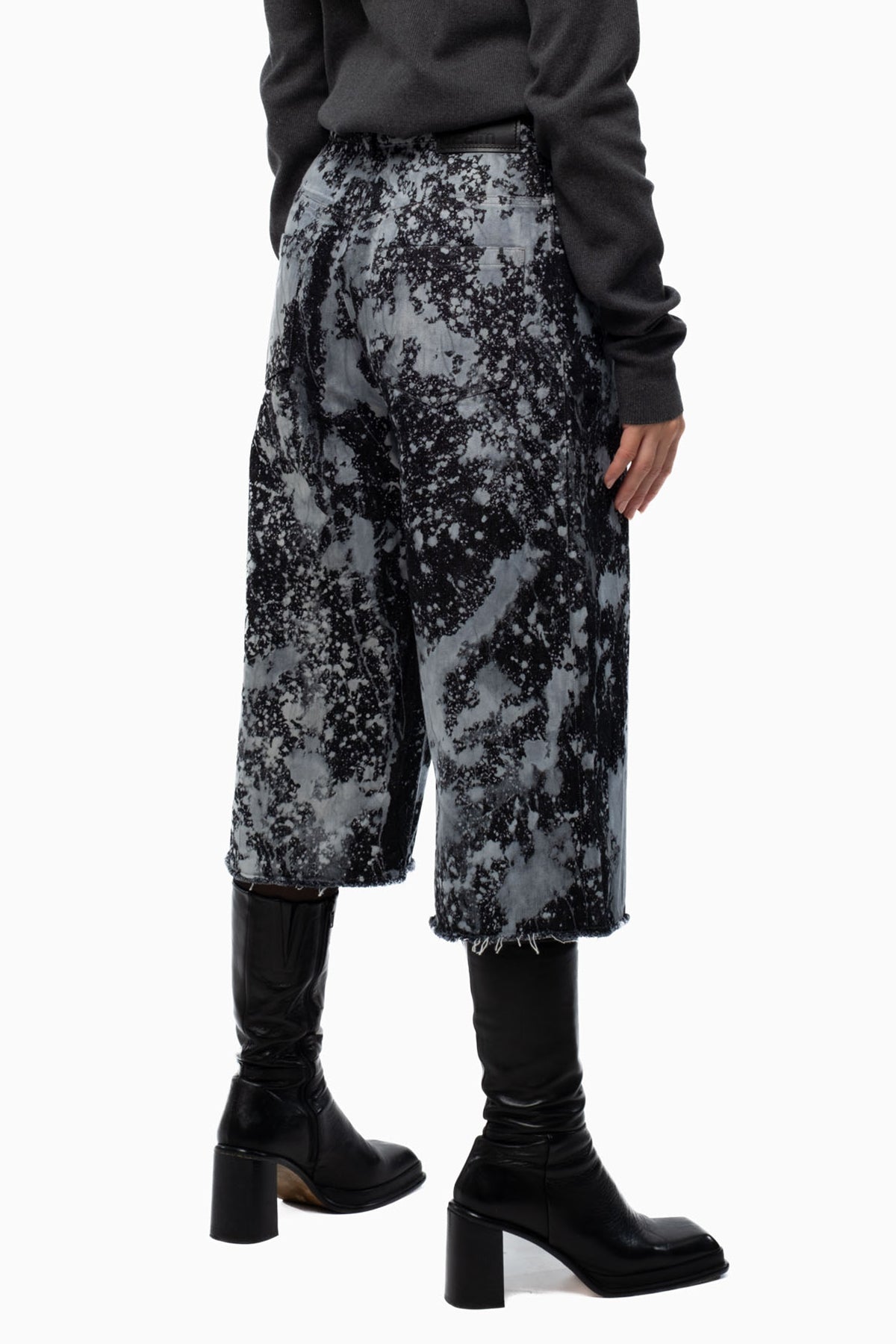 - Raw-edge side seams and hem feature